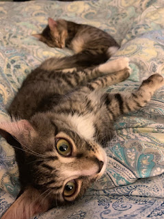These kittens are very snuggly and sweet. I've warmed to them a little too the point that I've shared the same space with them without hissing. I'm still not back up in bed with Mom and Dad at night which makes Mom sad but Dad keeps reassuring her that I'll be back. The stinker Loki keeps getting banished to the bathroom in the middle of the night because he bites Mom's nose while she's sleeping. I think he's worried about her and trying to give her CPR.